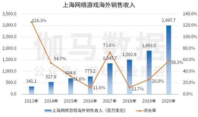 同时,对比2019年的802亿元,上海网络游戏销售收入增幅达到了24.6%,这一趋势与全球游戏收入迅速增长保持一致。在总销售收入中,上海游戏圈以自研产品为主,在999.2亿的销售总额中,上海自主研发网络游戏销售收入达823.8亿元,增量超过120亿元。2.2020年上海网络游戏海外销售收入约206.8亿元,增幅超50%