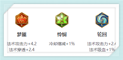 梦魇是红色符文里面增加法术伤害最高的,还附带着增加法穿。怜悯主要是缩短甄姬技能CD,轮回在增加法术攻击的前提下,还附带法术吸血,可以改善甄姬脆皮的设定。