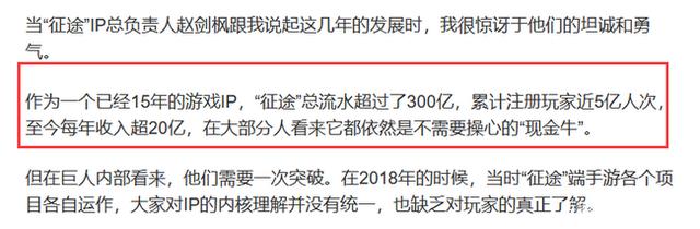 如果认为以上说法过于笼统,我们再来看2020年,征途IP赛道负责人、制作人小剑曾透露的一组数据:去年《征途》系列产品累计流水已超300亿元,累计注册用户超5亿人次。并且,新玩家还在不断增长中。