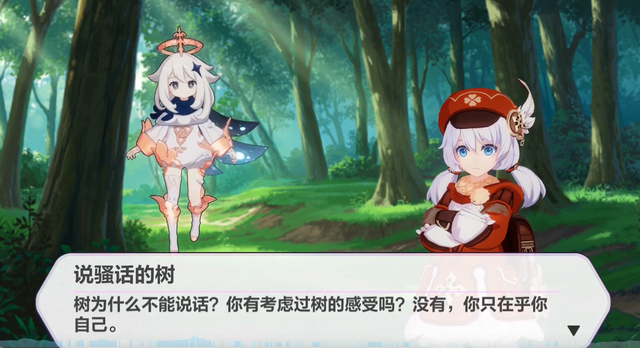 当踏进了低于森林的时候,咱们就撞到了一个“胆小的蒙德人”,这取名的方式也太随便了吧!随即看到了一棵会说话的树,不过这棵树比较能说会道。旅行者罗莎莉亚以为他是帮助通关的。可是树回答道,它只是一棵寄宿在这里的外乡树,并告诉大家它叫“玉树临风”!好家伙,这和旅行者一样是个会说骚话的外乡人呀!