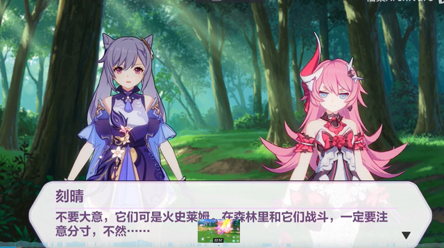 听完了树的介绍之后,一行人再度起航。当遇到一群史莱姆的时候,罗莎莉亚不屑一顾,可刻晴表现得特别谨慎。 并表示“不要大意,这是火史莱姆”。难道穿越到了崩坏3还是没有忘记雷+火=超载(火伤)全屏免疫的痛?身旁可莉也表示吃过火史莱姆的苦头了,看来,这次联动还是比较认真的嘛。