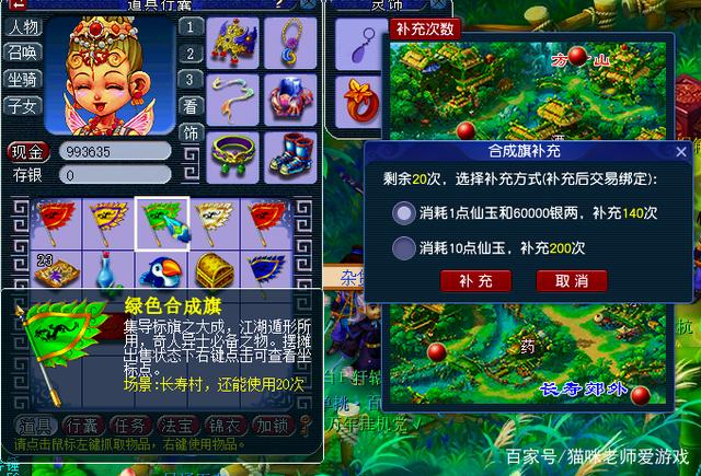 答案是:20次。触发仙玉补充有两个选择,要么仙玉+梦幻币;要么纯仙玉充能。为了鼓励玩家仙玉充能,纯仙玉的飞行旗上限次数是200次,而仙玉+梦幻币是140次,不过猫咪老师还是选择第一种仙玉+梦幻币的补充方式,毕竟仙玉用到的地方还有很多,飞行旗优先级排在后面。最后说一句,不管是哪种补充方式,只要充了能的旗子就变成了绑定了,无法在交易出售。