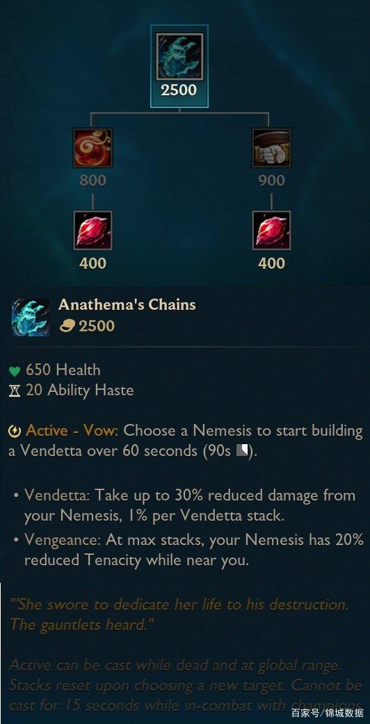 三、新装备:憎恶锁链2500金币、650生命、20技能急速 主动:选择一名宿敌并开始叠加仇恨,60秒叠满,CD90秒 。每层仇恨使你获得对宿敌减伤1%,最高30% 。仇恨叠满后,当宿敌在你附近时,宿敌的韧性减少20%。