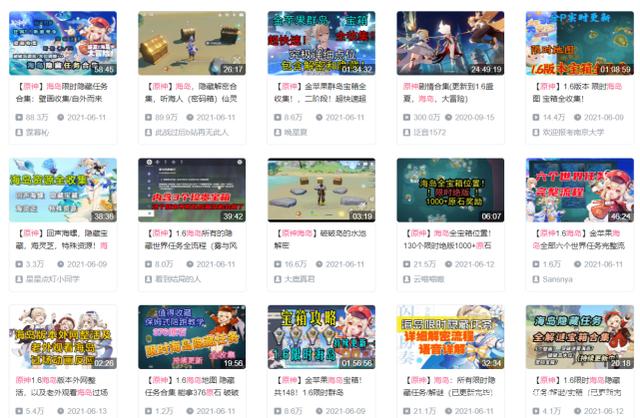 打开某站“以原神、海岛”搜索,大多数内容都是跟新活动有关的。比如说宝箱全攻略,海螺全收集,机关解谜,素材收集这些。其中播放量多的已经八九十万,四五十万的也不少。而这就带来了一个问题: