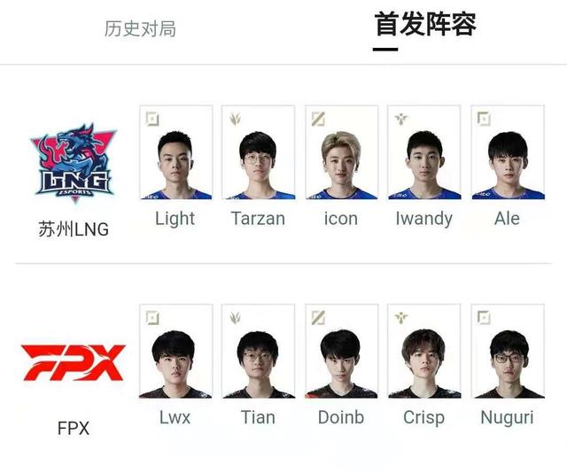 接着就是FPX和LNG的比赛,LNG这边首发上单阿乐,打野Tarzan,中单icon,下路Light加Iwandy;FPX首发上单Nuguri,打野Tian,中单doinb,下路Lwx加刘青松。