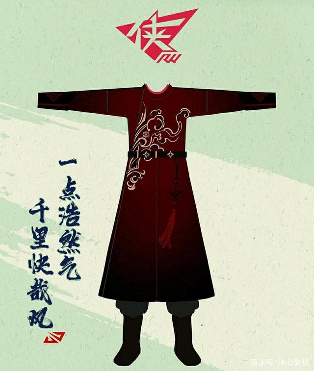 这件明制贴里袖口紧束,内搭同色中衣中裤,饰以革带与腰佩点缀 , 整套搭配流畅利落 。 胸口与下摆的图案均为火焰的变体 , 消解黑色沉