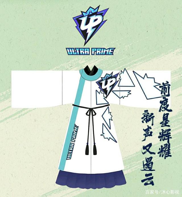 宋制圆领袍搭配中衣和褶裙 , UP 的战袍拥有本次最具现代化的设计 : 白底圆领袍上大量使用战队 logo 轮廓的几何图形,左肩处更是直接 印制了原版 logo , 对角的下摆处则以 UP 的全称字母相呼应 。 不对称 的设计中蕴藏奇妙的碰撞感,诞生的火花会照亮新的可能。