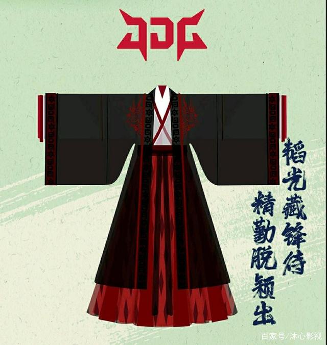 JDG 战队套装为大袖衫、交领上孺和齐腰裙的魏晋风搭配。 配色选 用经典黑、红、白,大袖衫衣缘与袖口纹饰均为 “ JDG ” 三个字母的