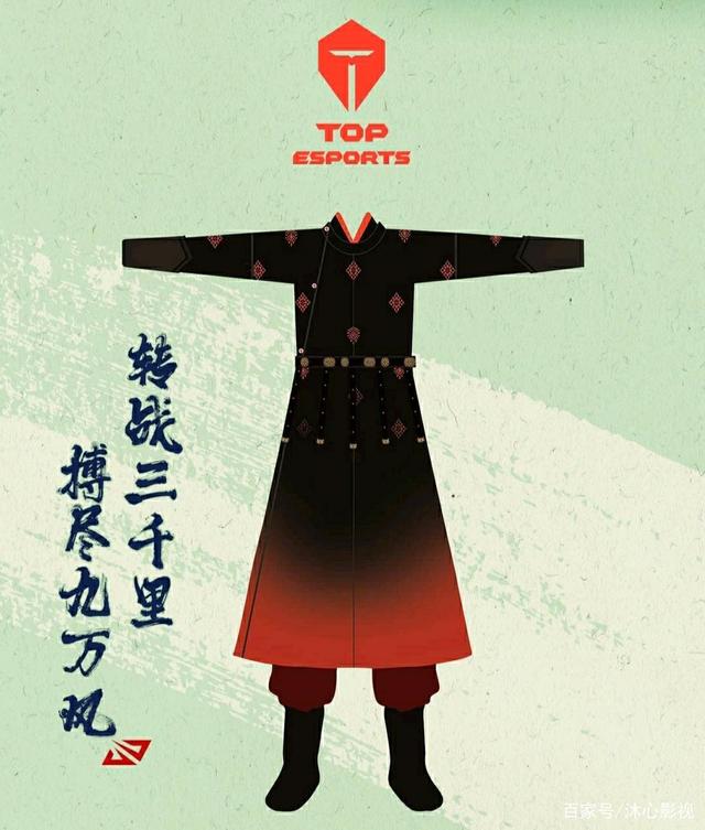 TES 战队选择了黑红折变唐制圆领袍与红色中衣、中裤的搭 配,腰 间黑底金饰的躞蹀带将身姿映衬得更为挺拔。 TES logo 的两种变体 图案都颇具古意 , 和服饰完美融合 。 这套华服的设计风格偏向传统与 简约,是一套兼具设计感与实用性的劲装,展现了战士的骁勇气质
