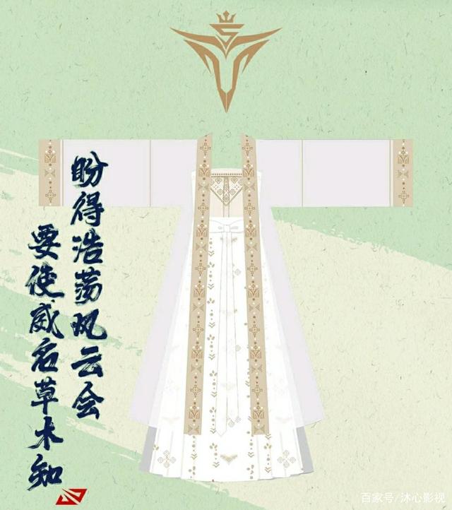 V5 战队选择了宋制直领对襟长褙子和褶裙的搭配组合,式样古朴简 洁 。 裙身 、 农缘与袖口上的图形纹饰 , 多为字母 ” V” 各种形态的变 体,正是本套华服设计中的点睛之笔。 取自 V5 战队 logo 的淡金色 落于纯白底色之上,清婉雅致又不失高贵感。