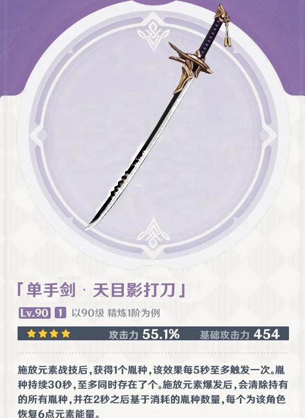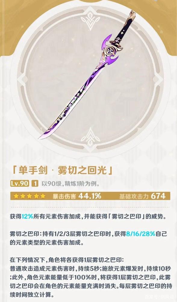 这把新五星单手剑的基础攻击力非常高,副属性的是暴击伤害,强度非常高的一把武器,很明显迎合神里绫华而出的武器,适合神里绫华和刻晴(外观更适合刻晴),刻晴终于可以起飞了。