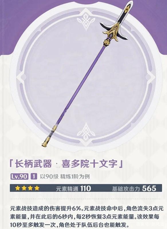 基础攻击可观,副属性增加元素充能,特效提升E技能伤害并恢复充能,副C和辅助的角色都适用,比如重云、北斗、辛焱,