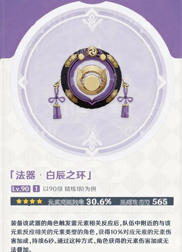 第五把:白辰之环-四星-锻造获取基础攻击比较高,副属性增加元素充能效率,特效提升队伍元素伤害,适合辅助和副C佩戴,如:砂糖、丽莎,