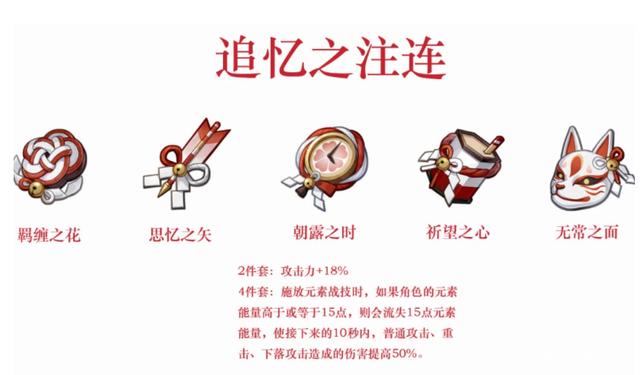 追忆圣遗物套装,两件套增加攻击力,四件套提高普通攻击、重击、下落攻击伤害,适合主C佩戴,如:宵宫、公子,甘雨、打普攻的菲谢尔,