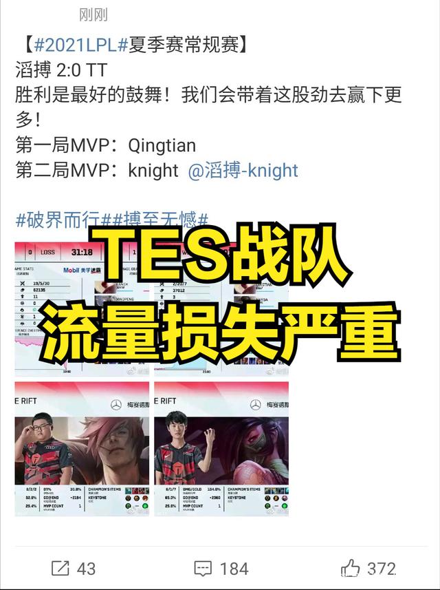 在TES战队获胜之后我个人也是去了TES战队的官博当中去进行了观看,我个人也是发现了TES战队的官博相比以前也是发现了很大的改变,其中改变最大的就是TES战队的流量迅速下滑,尤其是阿水在公布恋情之后,TES战队在阿水没有公布恋情之前,只要比赛获胜之后那么TES战队的官博就会瞬间上千评论,而如今TES战队的官博才仅仅有几百条。