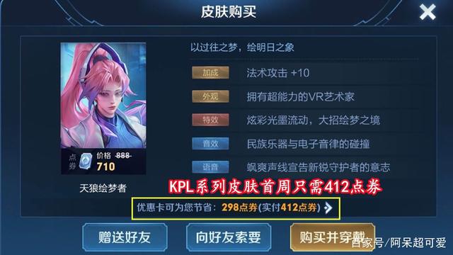 当然了,我相信大家最关心的还是价格问题,其实KPL系列皮肤都是有史以来都是最良心的,通常情况下,在这款皮肤上线之前,官方会出一个活动,该活动可以获得对应的优惠卡,到时候可以直接使用在kpl限定皮肤上。