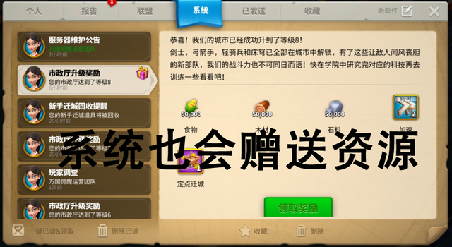 还有就是系统的奖励,当等级达到一定后,系统会通过邮件的方式发送奖励,而这些奖励中有失误、木材、时间加速甚至还会有定点迁城,这些资源都是非常有利于联盟的发展了。而有了这些资源后,玩家们可以合理使用从而使自己的联盟变得更加强大。其中,市政厅升的等级越高,系统送的福利就会越多并且奖励也会越丰厚。