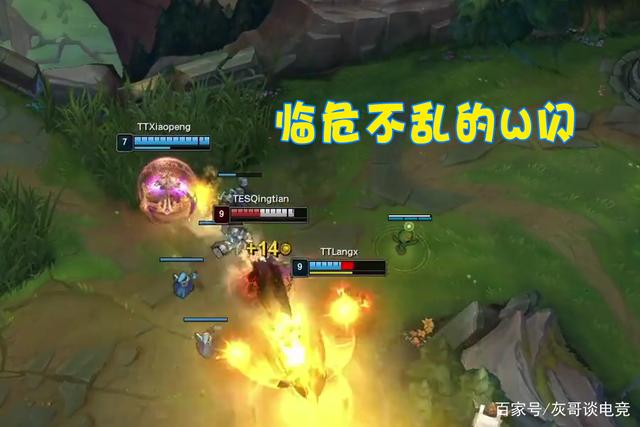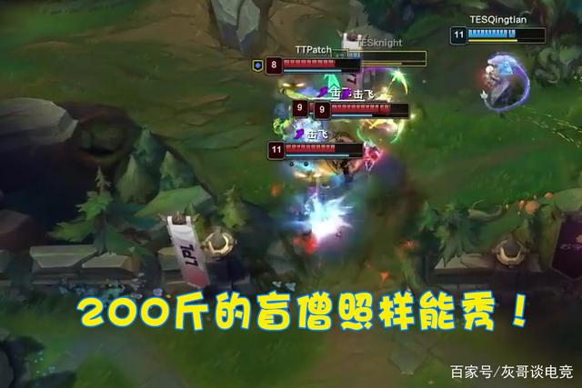 第二局晴天选出了当前版本非常流行的上单盲僧,对线期和狼行没有擦出什么火花,导播也几乎没有给镜头,存在感很低,但到了中期团战晴天就开始操作了起来,几波大招的释放都非常完美,尤其是下面这一脚“双人回旋踢”,晴天借泰坦位移摸眼R闪踢回了EZ,手速非常之快,恰巧泰坦在被踢到的瞬间反身一钩,看起来就像是一脚把两个人都给踢回去一样,视觉效果还是很不错的。