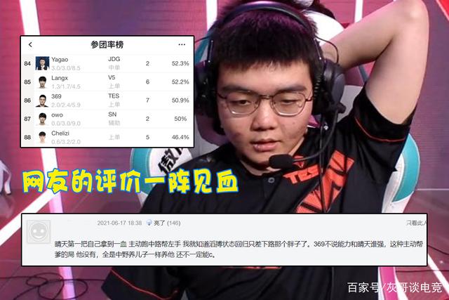 相比较之下原首发上单369的战术地位和晴天就有所不同了,他在场上的时候Karsa帮上的次数非常多,相对的照顾中路和下路就少了一些,并且369的风格是偏向于打对线优势的,游走也比较少,根据数据显示他在今年春季赛中的参团率仅为55%,如果晴天在场时TES双C的状态可以越战越勇的话,恐怕369想要重返赛场就比较难了。