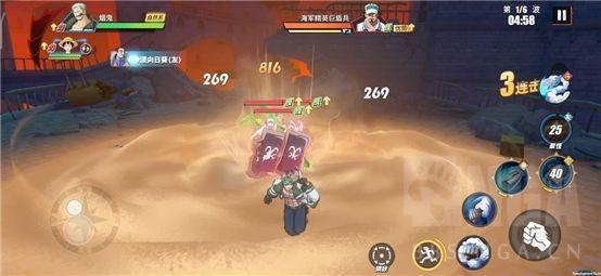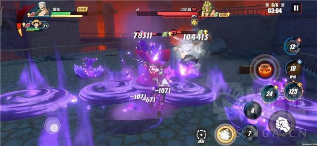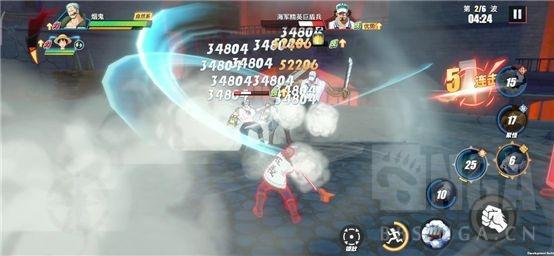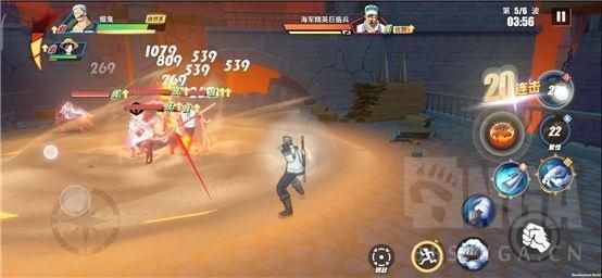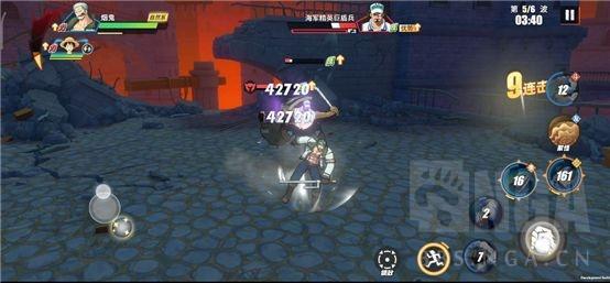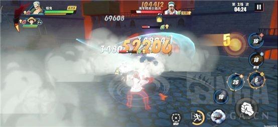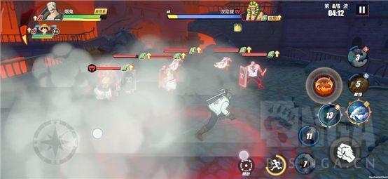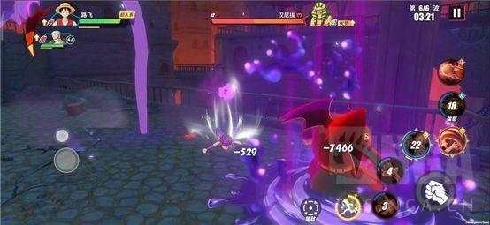 这一波出现的敌人不是很强,只要控制好距离就不会被打到。上一波用烟鬼打完之后,替换路飞登场,然后使用[橡皮·抓]控制汉尼拔,并借这个砸击效果同时打其他敌人。