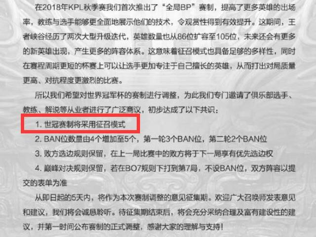 在2018年的时候,王者荣耀对于旗下的比赛进行一次非常深远的改革:将比赛当中的BP方式由征召模式改为了全局BP(即一支队伍本场用过的英雄不可以再用第二次),而这种全局BP的模式也一直延续到了今天。这种BP方式是非常受观众们喜欢的,因为在这种赛制的要求下,比赛的观赏性会大大提高。然而现在,王者荣耀官方似乎要走回征召模式的老路了。