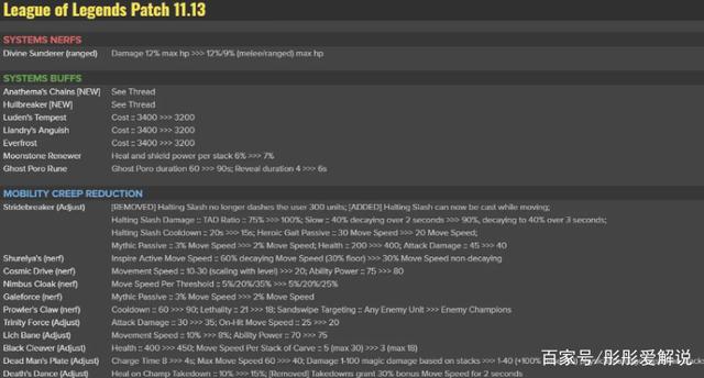 暗行者CD从60s变为90s,提供的护甲传统改为18,并且主动技能只能够选取敌方英雄作为单位目标。死亡之舞参与击杀后提供的30%移动速度机制也被移除。总得来说,11.3版本中对于一切能够增加机动性的装备,都进行了一些削弱。所以下个版本中,将会有着非常明显的变动。