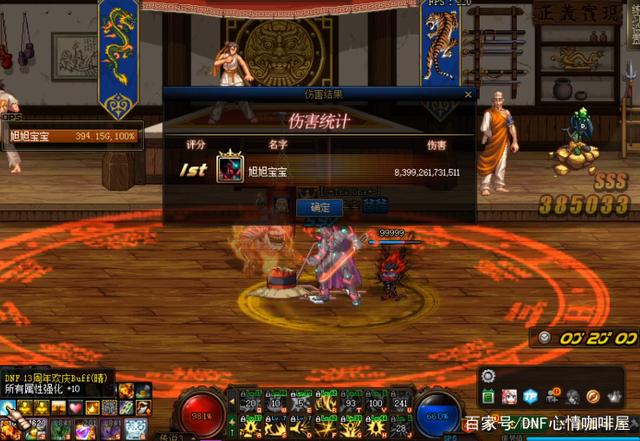 3个奥兹玛相关道具,把旭旭宝宝的红眼,又提升一个档次,在修炼场20S绿沙袋,打出8.39万亿伤害。但这里要提醒一下,13周年庆有欢庆buff,在左下角能显示,携带了10点全属性强化。也就意味着,旭旭宝宝红眼的伤害,得剔除10点全属强才行。