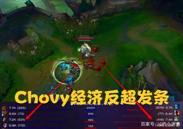 可即便是被针对,Chovy的经济依旧是领先全场。但HLE整体经济跟上局一样是落后LSB的。
