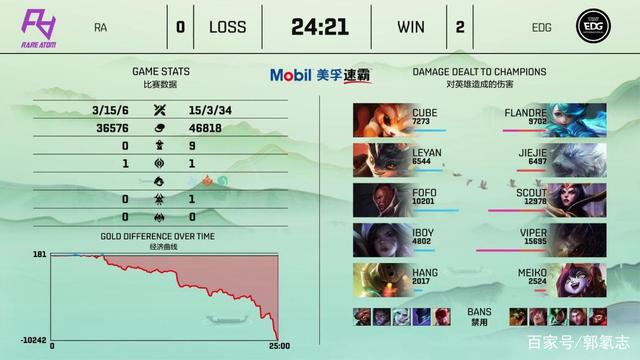两边战队交锋,结果却让人意外。RA在EDG的手中根本撑不了几个回合,最终两场比赛轻松被击败以0-2告终,而EDG这边局内全线开花,每个对线路都打出了优势,在手握优势的情况下,EDG牢牢掌握场面局势,慢慢的蚕食RA的经济,最终在经济差不断拉大的同时抱团击败了对方。