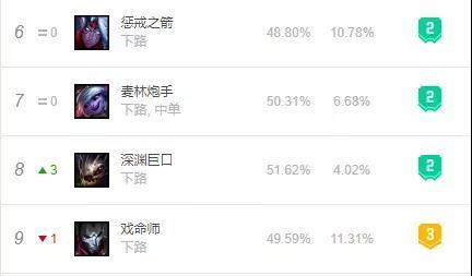 大嘴胜率直线上升现在大嘴的数据已经比以前好非常多了,胜率已经来到了51.62%,登场率也突破了4%,总算是脱离了超冷门英雄的行列了,成为了冷门英雄。