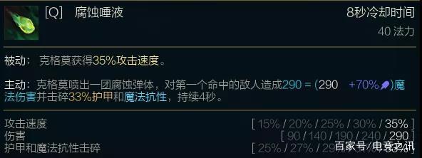 大嘴Q技能介绍这里说下大嘴的加点问题,主W肯定是没问题的,副E还是副Q呢?有人说副E可以推线,有人说副Q有攻速,小编觉得副Q的效果要比副E更好一些,Q技能的被动攻速还是挺重要的,而且减双抗的效果也很好,点满之后能达到33%,相当于一个大轻语了,顺带一提,R技能的二级大招和三级大招并不是很重要,反正也只是用来探草丛和补点伤害,所以可以把11级的加点挪给Q技能。