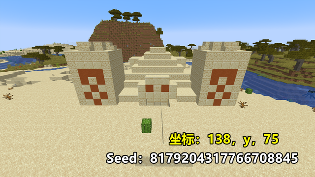 这个种子没有奇特的遗迹,但是却有丰富的物资。众所周知,沙漠神殿是一个有着四个宝箱的金字塔遗迹,一般来说都能搜刮到不少物资。这个种子也有一座沙漠神殿,而且是一座半掩埋式的沙漠神殿,好像在暗示它不同凡响一般。