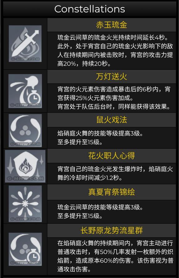首先一个就是命座的修改,这次宵宫的在命座上只对高命座进行了一个改动,并且还是加强的状态。主要体现在四命和六命上面,四命爆炸后冷却时间由之前的1秒cd变成1.2秒,也就是可以多减0.2S的CD。六命的加强更为明显,40%概率50%伤害变成50%概率60%伤害,不仅仅是概率增加了10%伤害也增加了10%。