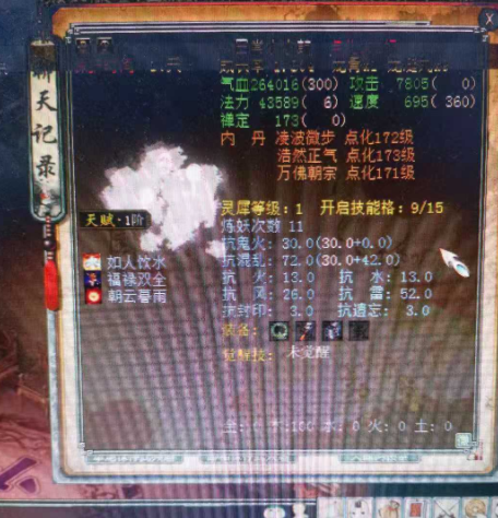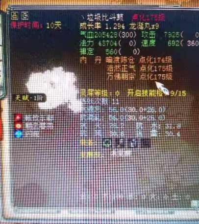 再来看这只鼓,已经升到了176级,技能栏依然是三开,技能带的是帐饮东都、朝云暮雨,看这几个技能,着实有些伤心啊。带朝云暮雨的拨浪鼓比斗起来是相当给力的。