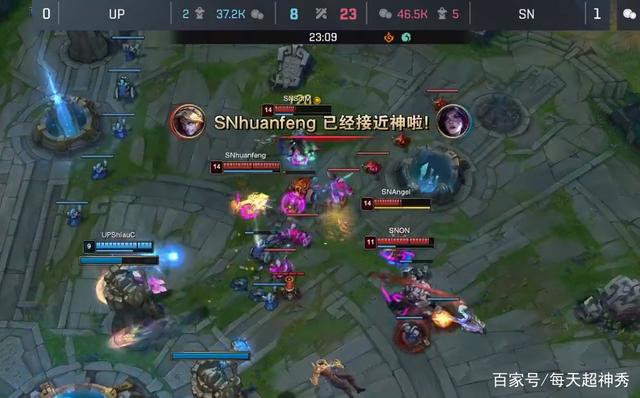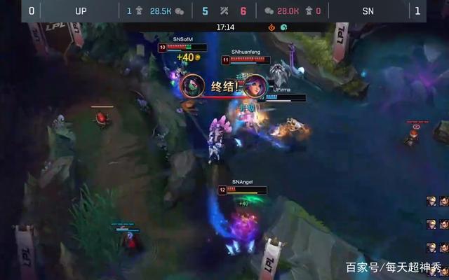 由于优势太大,SN众将无压力控住大龙,带着大龙Buff,SN抱团进攻UP中路,SofM赵信配合泰坦开团,装备成型的Angel阿卡丽冲进UP后排,轻松限制马哥Smlz卡莎的输出空间,再加上火力全开的Huanfeng探险家,SN再次团灭UP,在24分钟内推平敌方基地水晶。