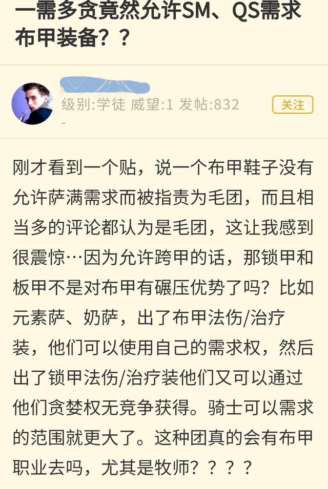这位玩家讲得很明白,混合职业在这种团队中有天然的优势,既然“需求权”大于一切,混合职业就用了明目张胆跨甲的权利,由于圣骑士和萨满可以向下兼容使用所有的奶装,而牧师和小德却没法反向兼容锁甲板甲,这导致低甲职业特别是牧师处于巨大的竞争劣势,因此牧师必然会抛弃这种团队!