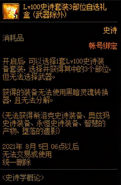 这个百级史诗套3部位自选礼盒就是说我们必须选择一个套装的三个部位,打个比方,如果我们需要命运歧路套装,那我们选了这套,就只能在这套的五件装备中选择三件获取了。而如果我们选择的是首饰、特殊装备或者混搭套(大幽魂这类的三件套装),那我们就是获得整套的装备了。所以,勇士们在做选择的时候一定要慎重考虑哦!