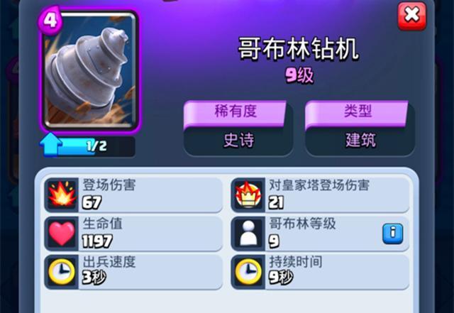 这张卡牌最大的特点就是性价比极高,这也是玩家为什么选择它的主要原因。它的类型属于建筑,在己方阵地可以拉扯对方的攻城卡牌,而且里面还会持续跑出哥布林来参加战斗。而在钻机被摧毁后,它里面还会继续跑出3只哥布林,这就相当于布置了一张锅炉或者墓碑,主要目的就是为了能解决对手像野猪骑士那样的卡牌。