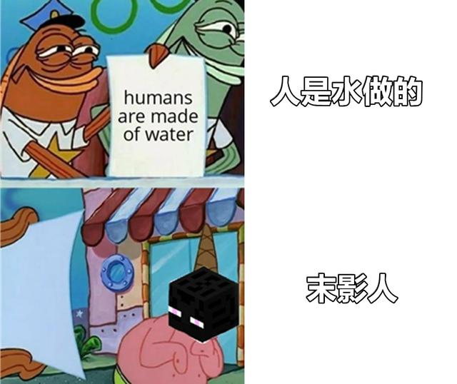 上生物课的时候我们都学过人体含有百分之五十以上的水,而且根据不同时期的人,这个数值还不一样,幼年时期的含水量还要更高,所以毫不夸张的说,人就是水做的。这是一位逻辑鬼才出现了,既然人是水做的,末影人又怕水,那么就等同于末影人怕人。