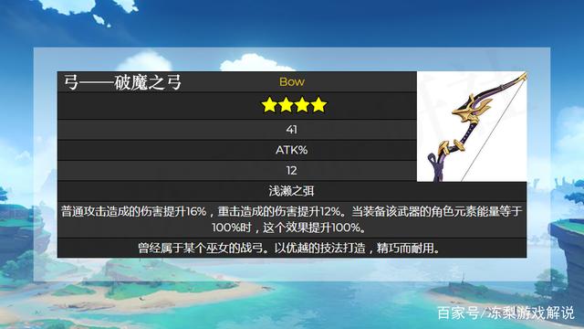 弓——破魔之弓。90级的属性,454基础攻击力,55.1%攻击力。满精炼效果:普通攻击造成的伤害提升32%,重击造成的伤害提升24%。当装备该武器的角色元素能量等于100%时,这个效果提升100%。