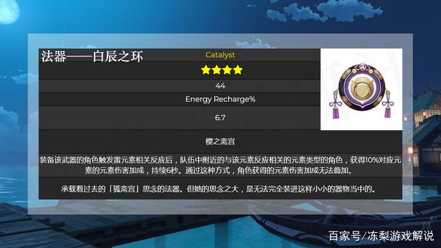 法器——白辰之环。90级属性,565基础攻击力,30.6%元素充能。装备该武器的角色触发雷元素相关反应后,队伍中附近的与该元素反应相关的元素类型的角色,获得20%对应元素的元素伤害加成,持续6秒。通过这种方式,角色获得的元素伤害加成无法叠加。