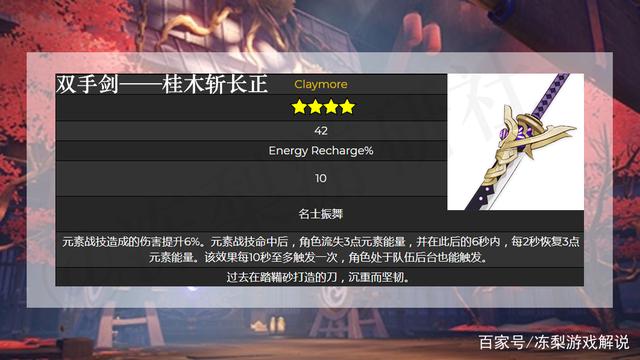 双手剑——桂木斩长正。90级属性,510基础攻击力,45.9%元素充能。满精炼时的效果:元素战技造成的伤害提升12%。元素战技命中后,角色流失3点元素能量,并在此后的6秒内,每2秒恢复5点元素能量。该效果每10秒至多触发一次,角色处于队伍后台也能触发。