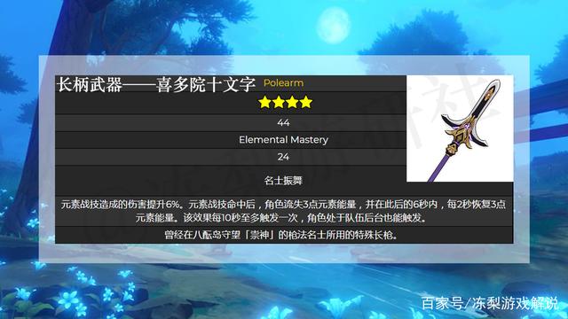 长柄武器——喜多院十文字。90级属性,565基础攻击力,110元素精通。元素战技造成的伤害提升12%。元素战技命中后,角色流失3点元素能量,并在此后的6秒内,每2秒恢复5点元素能量。该效果每10秒至多触发一次,角色处于队伍后台也能触发。