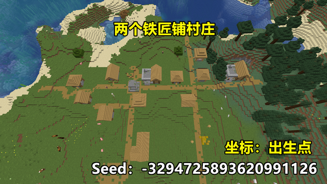 该种子出生点很不错,在一个平原上,平原连接着海洋和针叶林生物群系,而在出生点处,拥有着一个不算太大的平原村庄,村庄中有两个铁匠铺,算是很不错的开局了。
