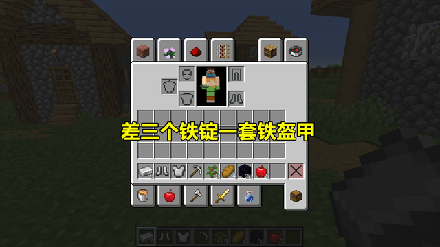 有铁匠铺自然要去搜刮一波,毕竟有两个宝箱呢,说不准就有钻石。但很可惜,这两个宝箱中并没有钻石的身影,只有一些铁套和铁锭,迷恋数了一下,只差三个铁锭就可以凑够一整套铁盔甲了,把铁镐那三个拿来正好,如果有分解装备的工作台就好了。