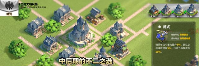 在《万国觉醒》这款游戏中,最先接触的就是建筑文明选择,包括罗马式、德式、韩式、中式等各具国家特色的建筑,不同的文明方式的加成也是不同的,另外部分文明还有特色兵种,属性略高于相同的普通兵种。要在在合适的阶段选择正确的建筑文明,能有效提高部队作战能力和加快游戏节奏。