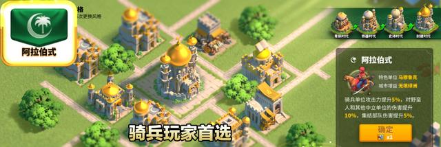 在游戏中主要是两个流派,“步兵流”和“骑兵流”,“步兵流”适合平民微氪玩家,“骑兵流”适用于中氪玩家,在理查没有问世前,曹源的战斗力爆表,所以选择“骑兵流”的玩家要为“曹源”氪金。之所以开局选择阿拉伯式,是因为有利于前期的日常活动,刷野蛮人、打城寨都有10%的伤害加成,另外提高骑兵5%的攻击力,很适用于前期的发育。
