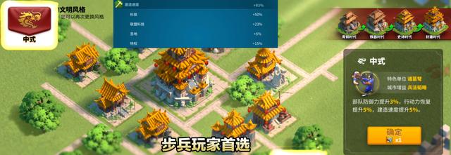 “步兵流”的话,中式文明是一个“万金油”文明,首先建筑速度提高5%,在头衔没有开放前,速度加成只能从符文、圣地、VIP等级上找,建筑的5%加速至关重要,在前期需要快速提高战力的情况下,能省下不少加速。5%的行动力恢复,提高日常活动的速率,另外防御力提高3%,提高作战能力,对前期过渡很友好。
