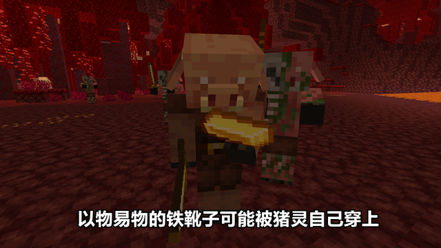 以物易物是猪灵的交易方式,玩家只需要将金锭扔在地上,猪灵便会跑过来拾起,然后放在眼前仔细端详个几秒,然后给你随手甩出一个道具作为交易品。但是你知道吗?在猪灵众多交易物品中,有一个道具猪灵甩出来后会有一定的几率再次捡回去,并且自己穿上,这个道具就是铁靴子。当然,这也不是百分百,只是存在一定的几率,大家可以去试试。