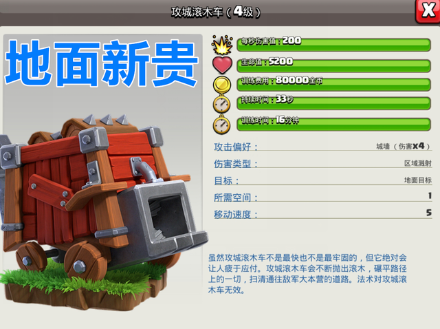 “攻城滚木车”绝对是地面流派的“新贵”它的特点是没有援军也能完成“切割”阵型的任务,现在地面流派仅剩的“8848”和“天皮超法”都是以“攻城滚木车”为主要的进攻手段,它的特点是滚没城墙以外在带走路径上的建筑,只要调好角度带走天鹰火炮的同时还能带走一个地狱塔或者是箭塔,这样的攻击机制显然要比“攻城战车”好用的太多太多,成为地面流新一代的王者众望所归。